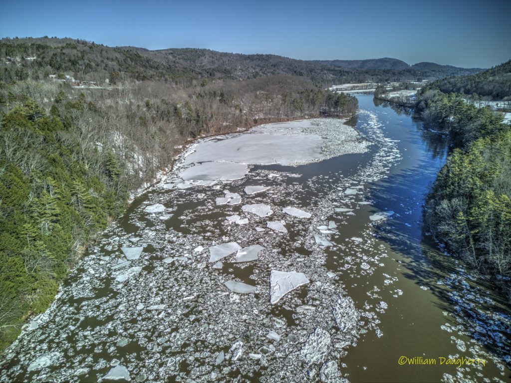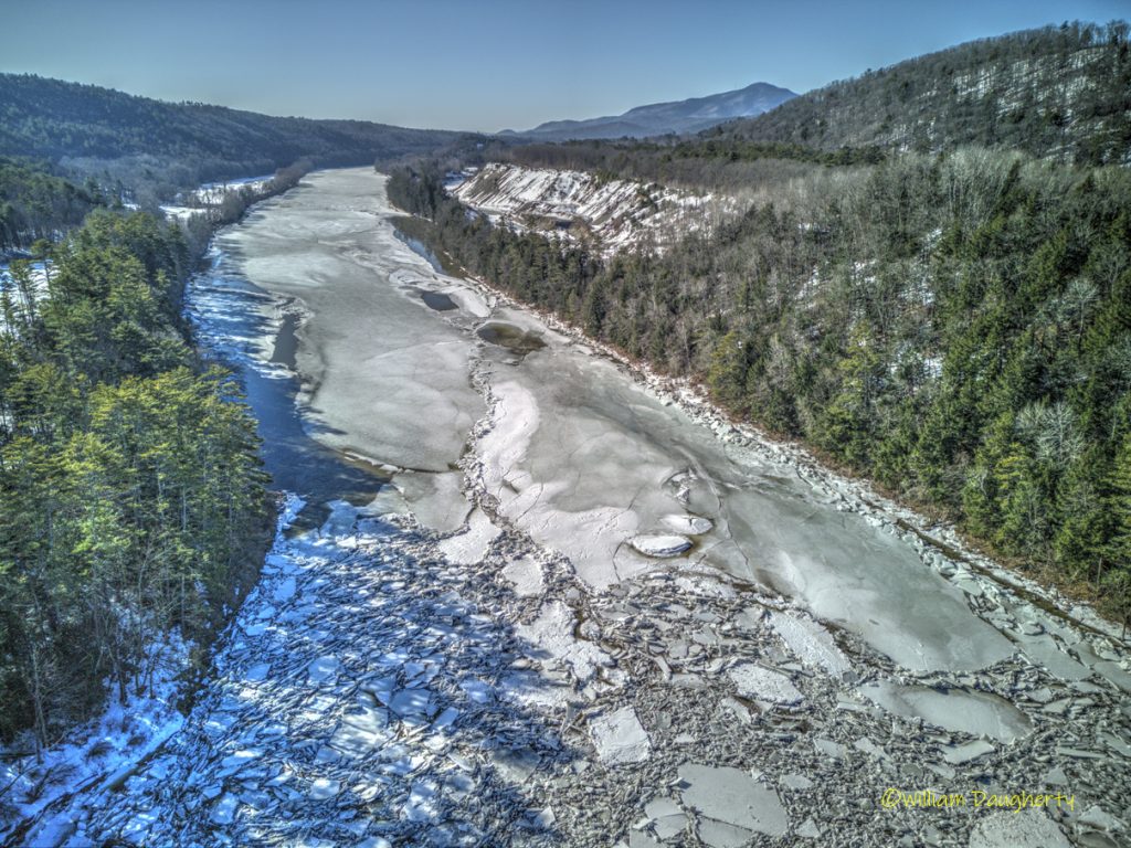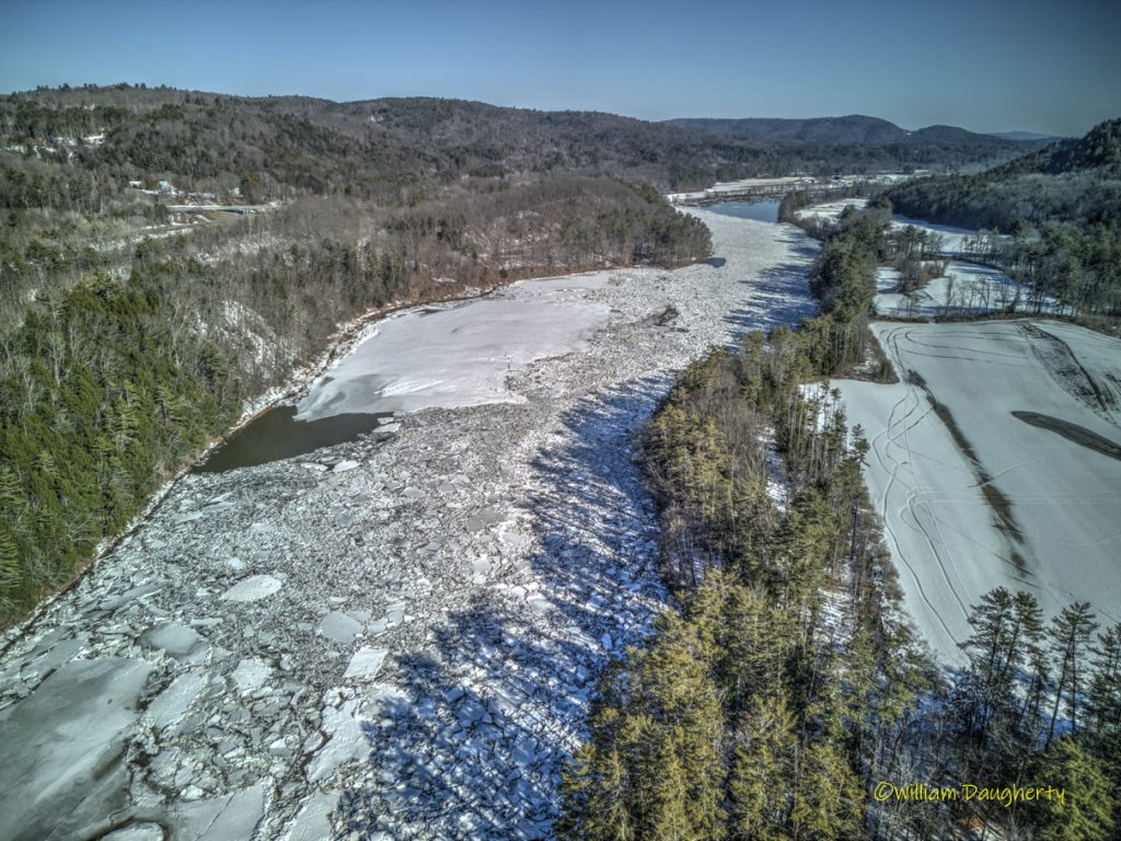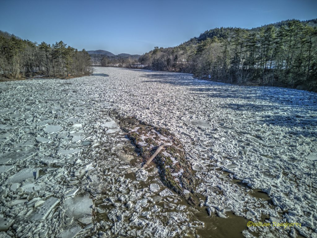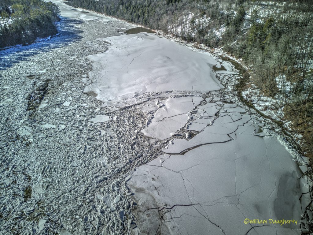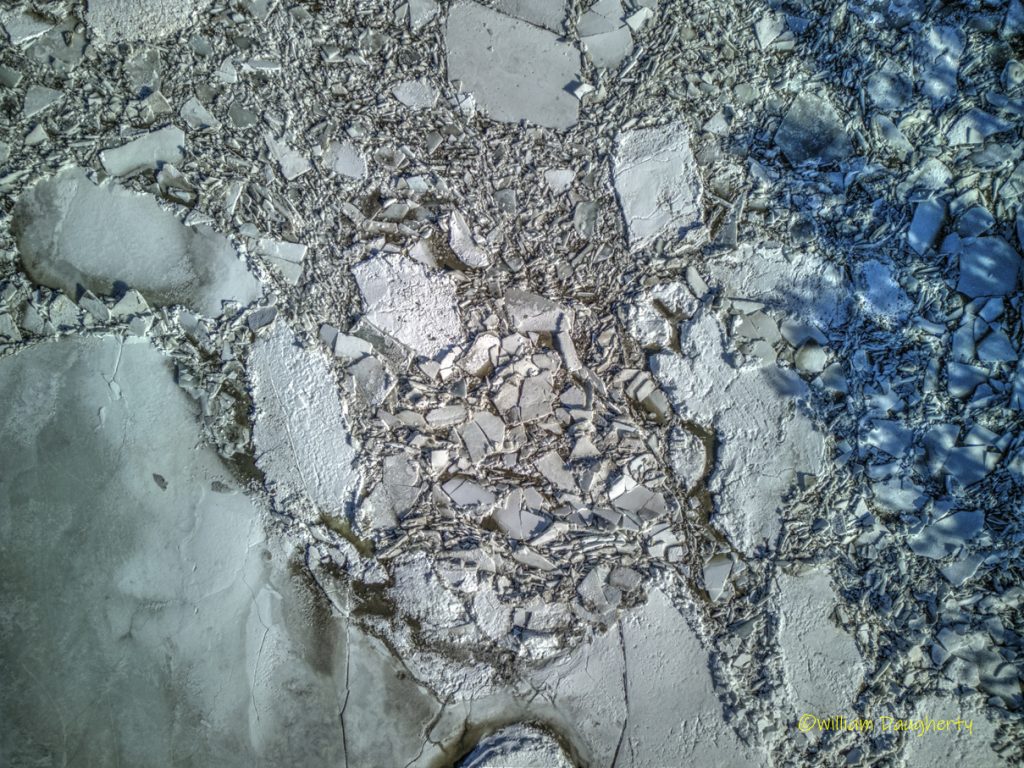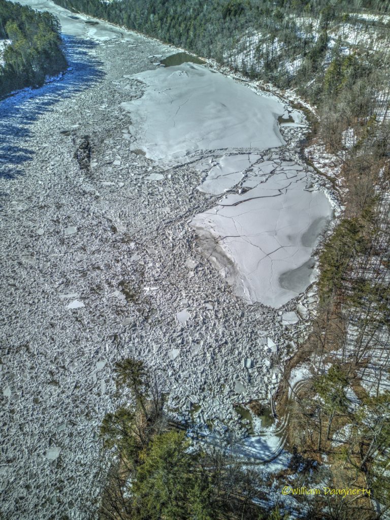 Some explanation is in order. When I arrived at the river, there was a mile-long stretch above and below the falls with a huge ice jam. I shot a couple of FPV runs up and down the jam, then I took some stills with a different drone. As I was packing up to leave, I suddenly heard tremendous cracking and crunching sounds. I looked over at the river and saw the ice floes flying by! I quickly launched another drone and took the last photo in the series, and the last two clips in the video. The final timelapse shot in the video shows what happened to all that ice that left the upper part of the falls. Fascinating!